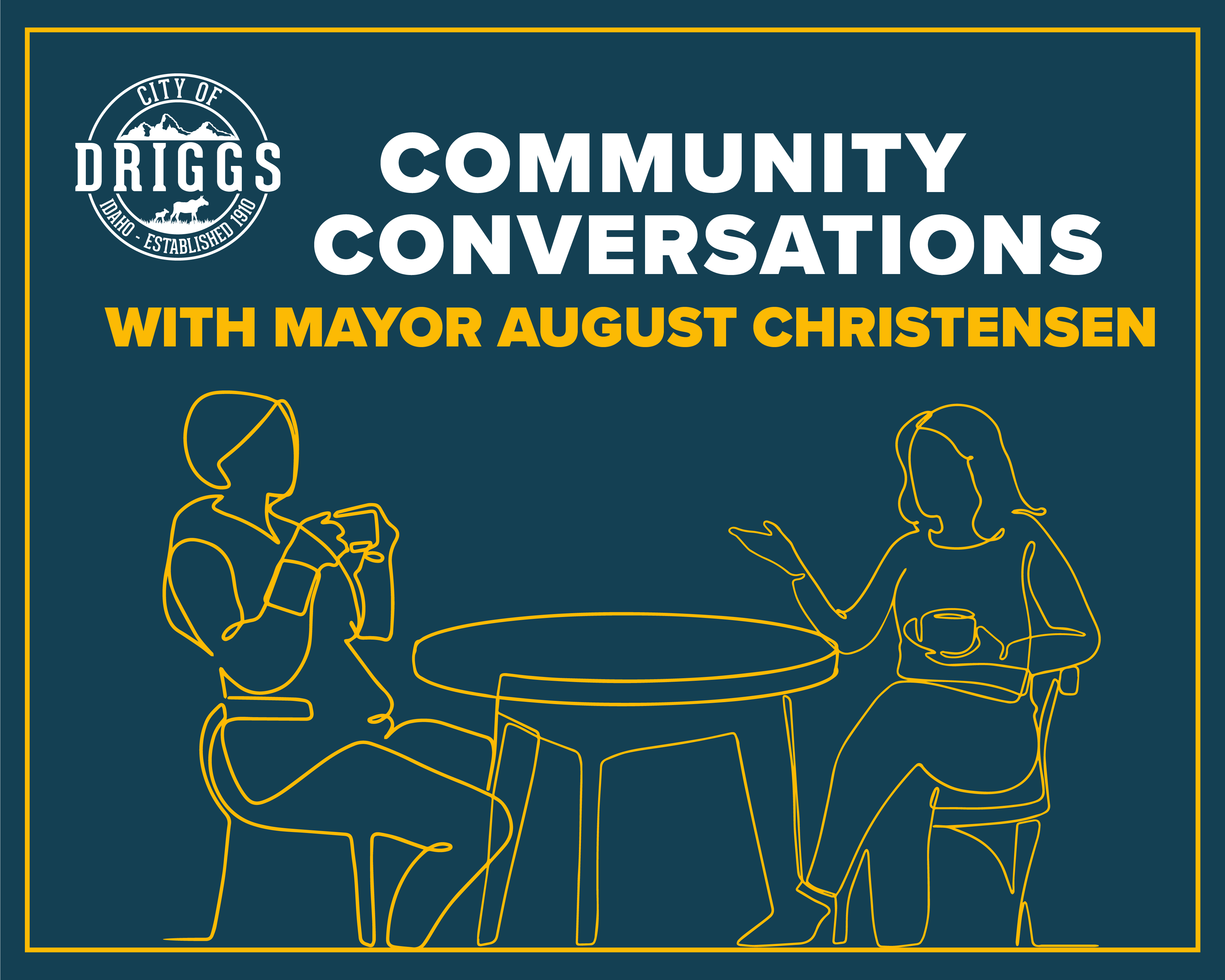 Join the conversation this Tuesday, June 24th, for the monthly Community Conversation with Mayor August Christensen from 4 - 5 PM at the Forage/Warbirds parking lot, 253 Warbird Lane in Driggs (on the south side of the parking lot).