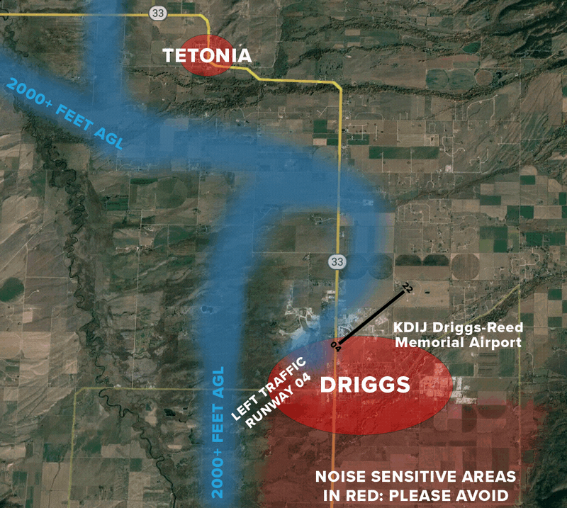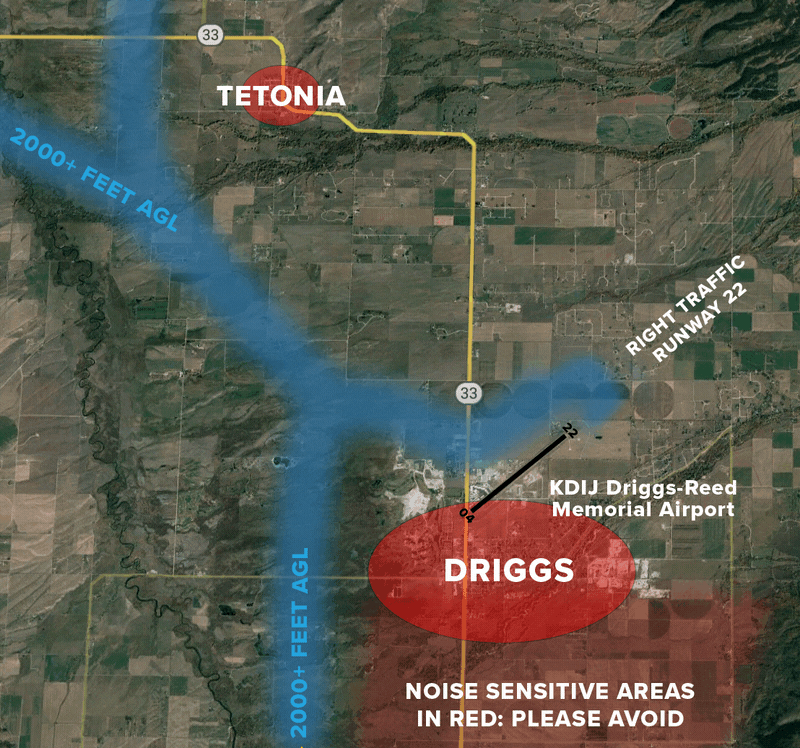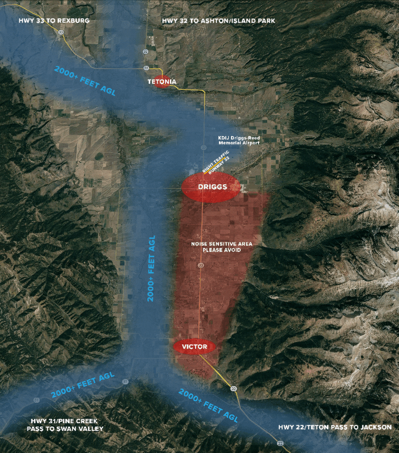 When operating aircraft in Teton Valley, avoid flying over the city of Driggs, all neighborhoods east of Driggs, and the towns of Tetonia and Victor. Always fly at or above 2000 feet AGL in the valley until the descent to pattern altitude or landing configuration is required.